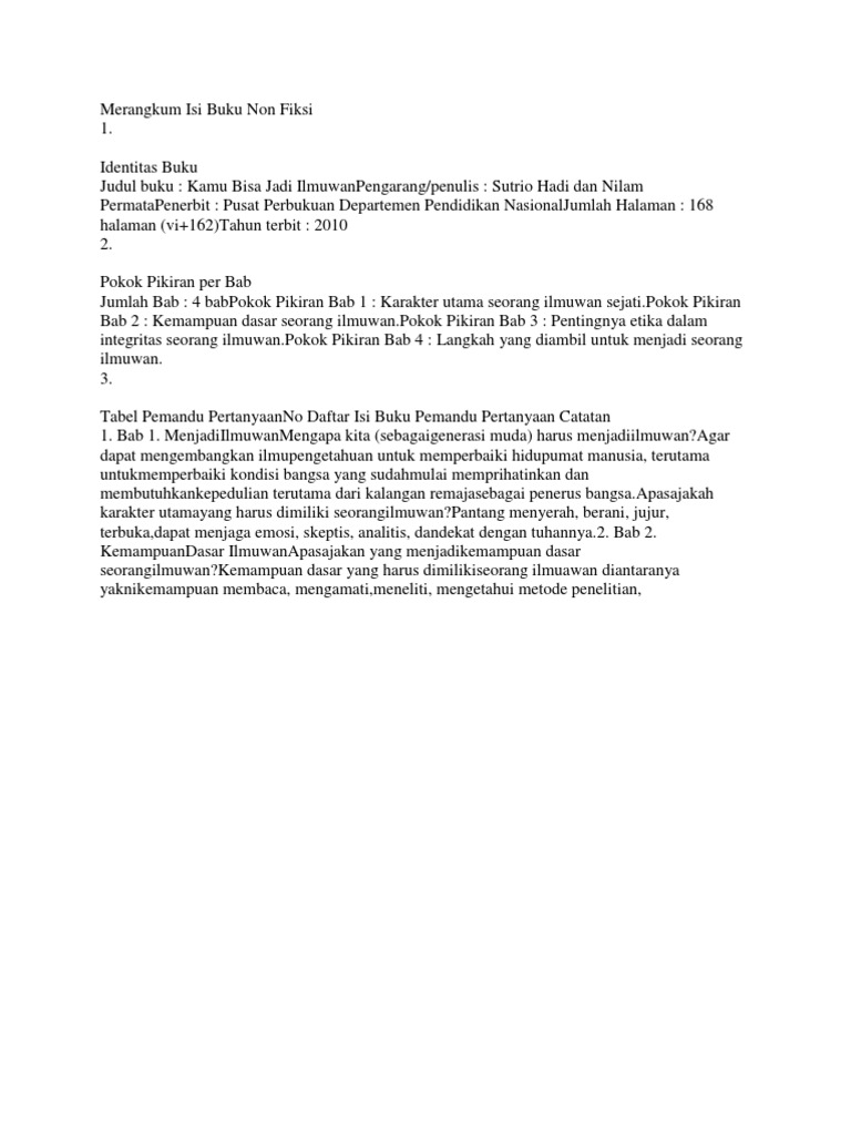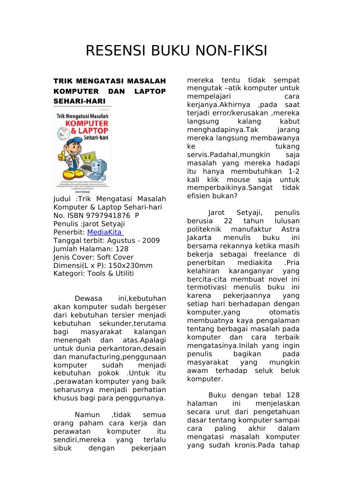 Struktur resensi buku antara lain identitas buku, orientasi, sinopsis, analisis, dan evaluasi. Kepengarangan buku o 5.4 4. Menulis ulasan buku non fiksi adalah suatu kegiatan menuliskan tentang bebeapa kekuatan, kelemahan, dan informasi yang berasal dari buku dan tersedia. Jenis format file buku elektronik atau digital adalah jenis buku kanak kanak jelaskan pengertian buku fiksi dan non fiksi jenis buku besar pembantu terdiri dari jelaskan perbedaan buku fiksi dan non fiksi beserta contohnya jenis jenis buku fiksi antara lain jenis buku ekspedisi jenis jenis. Buku ini tidak dijual dibanyak tempat karena buku ini merupakan tulisan hasil karya anak pmii komisariat walisongo purwokerto.